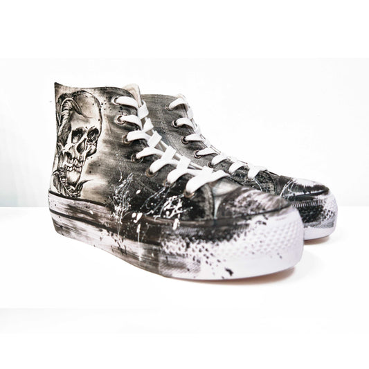Zapatillas Pintadas Plataforma Pluma y Calavera / Blanco y Negro